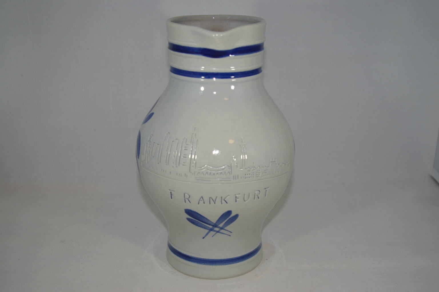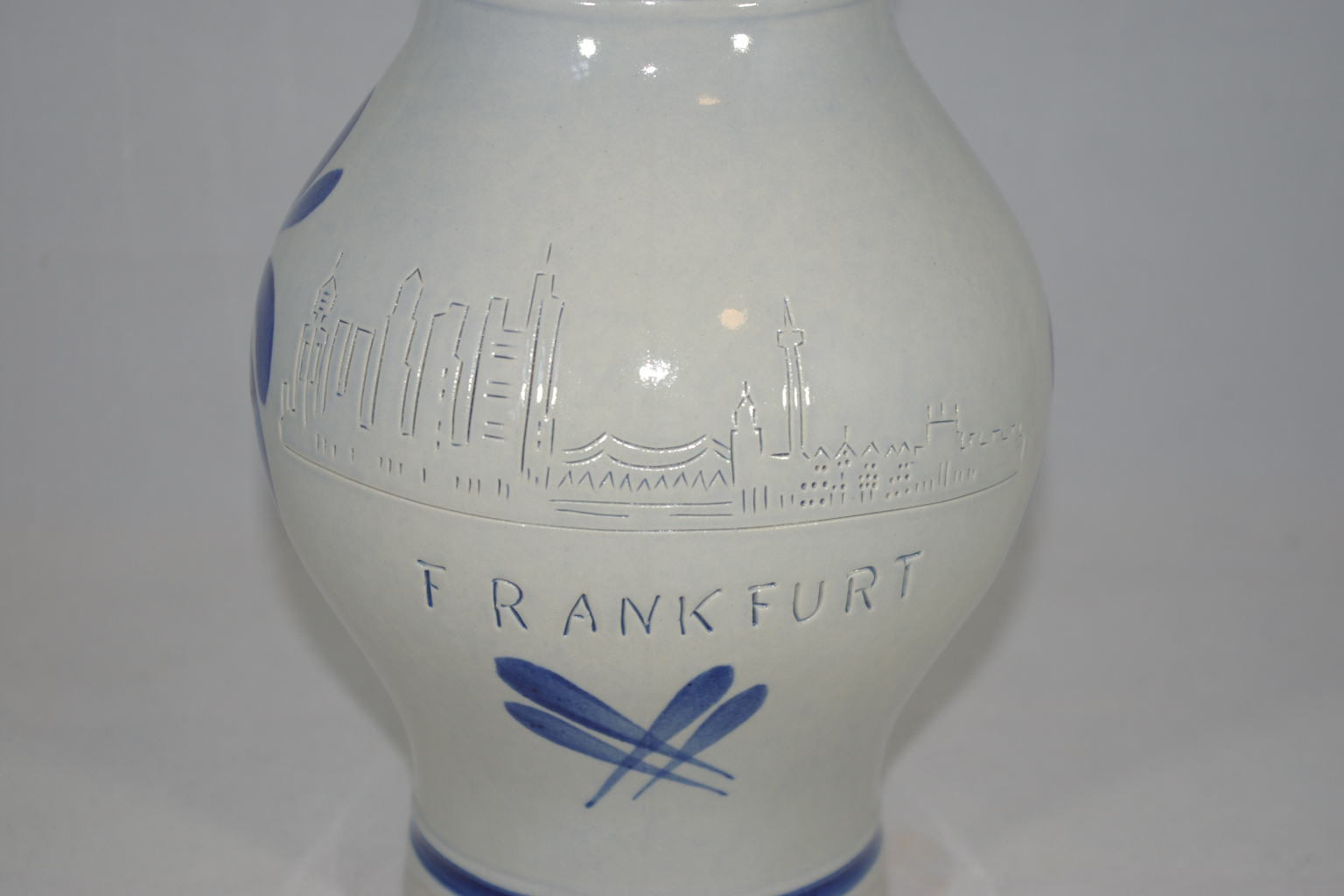 Dieser kunstvoll verzierte Bembel mit der Frankfurter Skyline verbindet echte Handwerkskunst mit regionaler Identität. Mit einem Fassungsvermögen von 1,5 Litern ist er der perfekte Begleiter für gesellige Runden – ob beim Apfelwein, Wasser oder anderen Getränken.